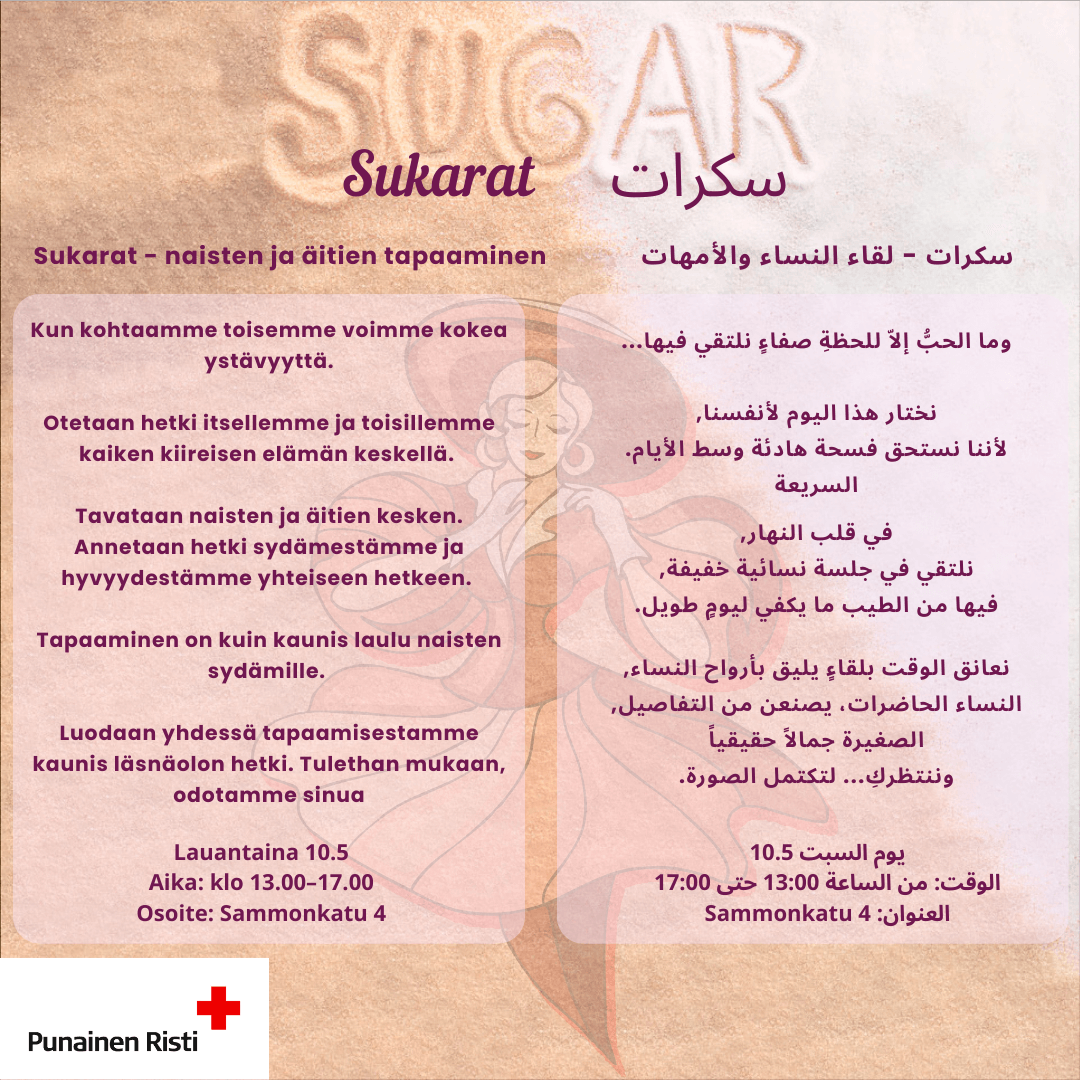 Olen tehnyt vapaaehtoistyötä Punaisen Ristin kanssa ja järjestänyt Sukarat-ryhmää naisille.